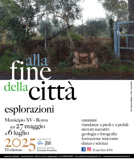“Alla fine della città”, un progetto Ti con Zero Ets, direzione artistica Fernanda Pessolano, è un approccio multidisciplinare arricchito da azioni innovative e dalla rilettura delle aree naturali e storico-artistiche, che interpreta il contemporaneo attraverso spettacoli itineranti, performance di danza, sentieri di arte e natura, reportage e intuizioni, seminari di pratica somatica e formazione itinerante delle arti del teatro di figura, fotografiche e narrative. Si va verso la periferia del Municipio XV camminando, pedalando, testimoniando, e si torna in città confidando, confessando, ricordando. Due mondi diversi, che viaggiano a tempi e ritmi diversi, che si specchiano e si riflettono così diversi, ma che si relazionano, si confrontano, si contattano nella loro profonda spiritualità.