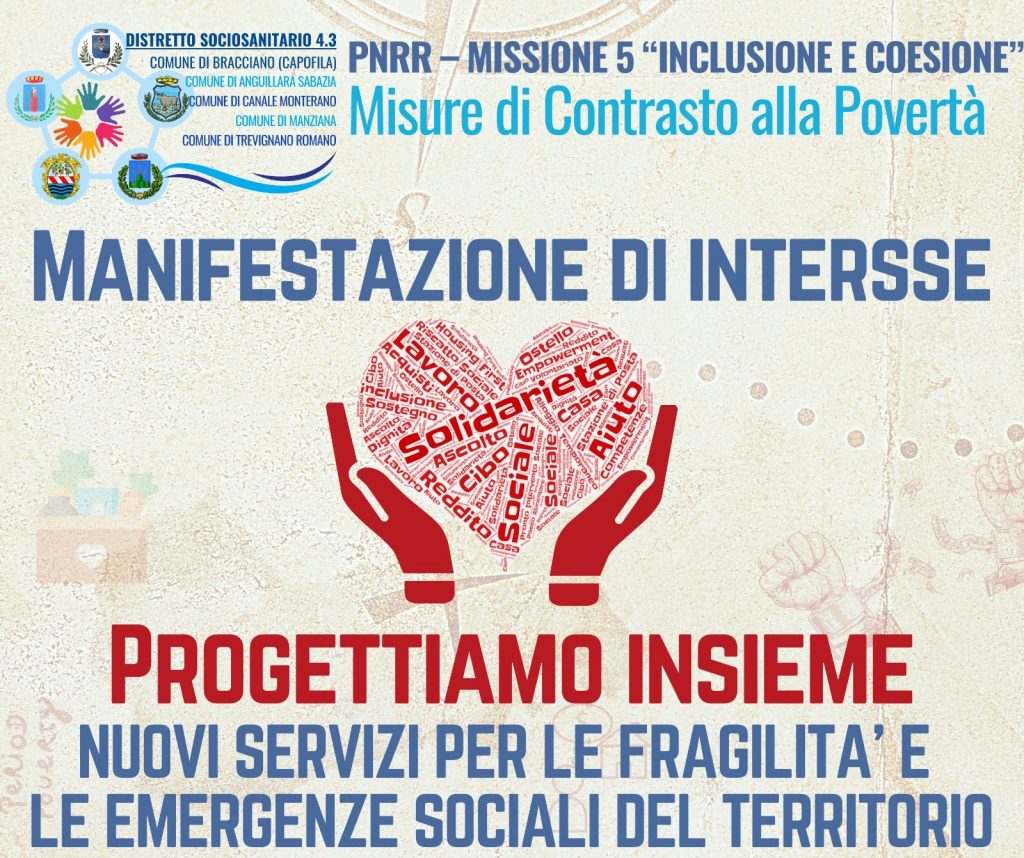 L’amministrazione comunale di Bracciano comunica agli enti del terzo settore e agli attori indiretti del welfare del Distretto Socio-sanitario 4.3, l’avvio di una Manifestazione di interesse finalizzata alla creazione di una rete territoriale universale per contrastare le fragilità ed emergenze sociali. E’ volontà di questa amministrazione infatti coinvolgerli per coprogettare questa iniziativa di grande rilevanza.