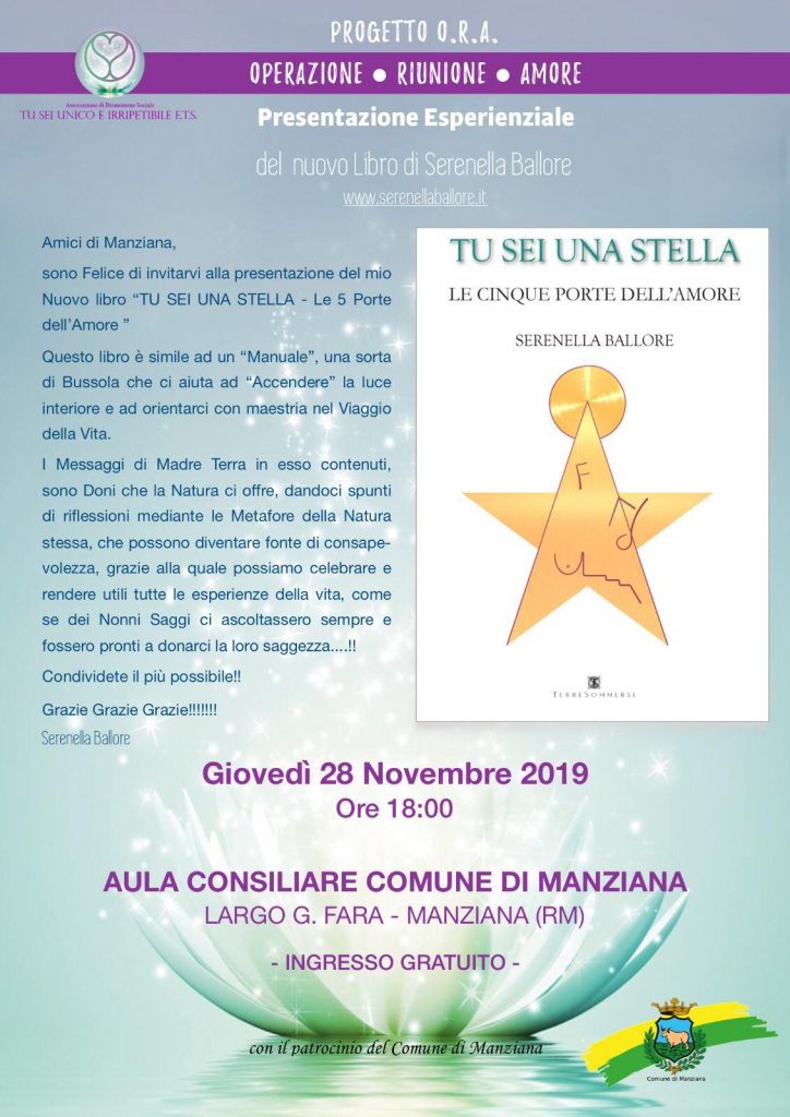 “Tu sei una stella. Le cinque porte dell’Amore”. Sarà presentato domani alle 18 nell’aula consiliare del Comune di Manziana il nuovo libro della “messaggera di felicità” Serenella Ballore.
