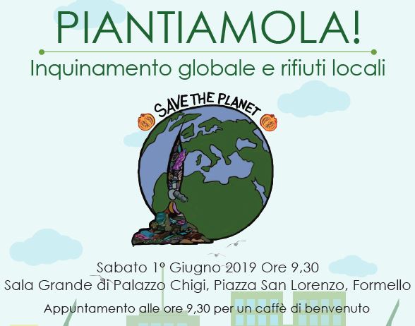 Cosa sta avvenendo nel nostro pianeta? I danni provocati dall’emergenza inquinamento, dalla plastica nei mari, dal danneggiamento degli ecosistemi, ma anche le ferite inferte al territorio da chi abbandona i rifiuti in strada o nelle campagne. Come affrontare la transizione verso un’economia verde ma anche cosa può fare ciascuno dinoi per cambiare stile di vita e per invertire la rotta. Se ne parlerà nella conferenza pubblica “PIANTIAMOLA! Inquinamento globale e rifiuti locali”, che si terrà sabato 1 giugno 2019 ore 9,30 nella Sala Grande di Palazzo Chigi, organizzata dai giovani dell’associazione “Il Melograno Solidarietà Ambiente Cultura” con il patrocinio gratuito del Comune di Formello.