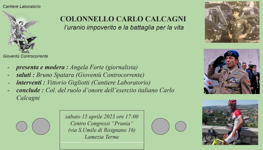 Si può essere e sentirsi “soldato” ed “atleta” e, pur nella malattia e nella sofferenza, essere esempio ed esprimere il massimo grado di solidarietà verso il prossimo? Noi diciamo di sì è di ciò abbiamo la testimonianza vivente di Carlo Calcagni, Colonnello del Ruolo d’Onore dell’Esercito Italiano, contaminato dall’uranio impoverito nel 1996 durante la sua missione come elicotterista in Bosnia Erzegovina. Sarà lui il protagonista e testimone dell’incontro pubblico, organizzato da Cantiere Laboratorio, dal titolo: “Il Colonnello Carlo Calcagni, l’uranio impoverito e la battaglia per la vita”.
