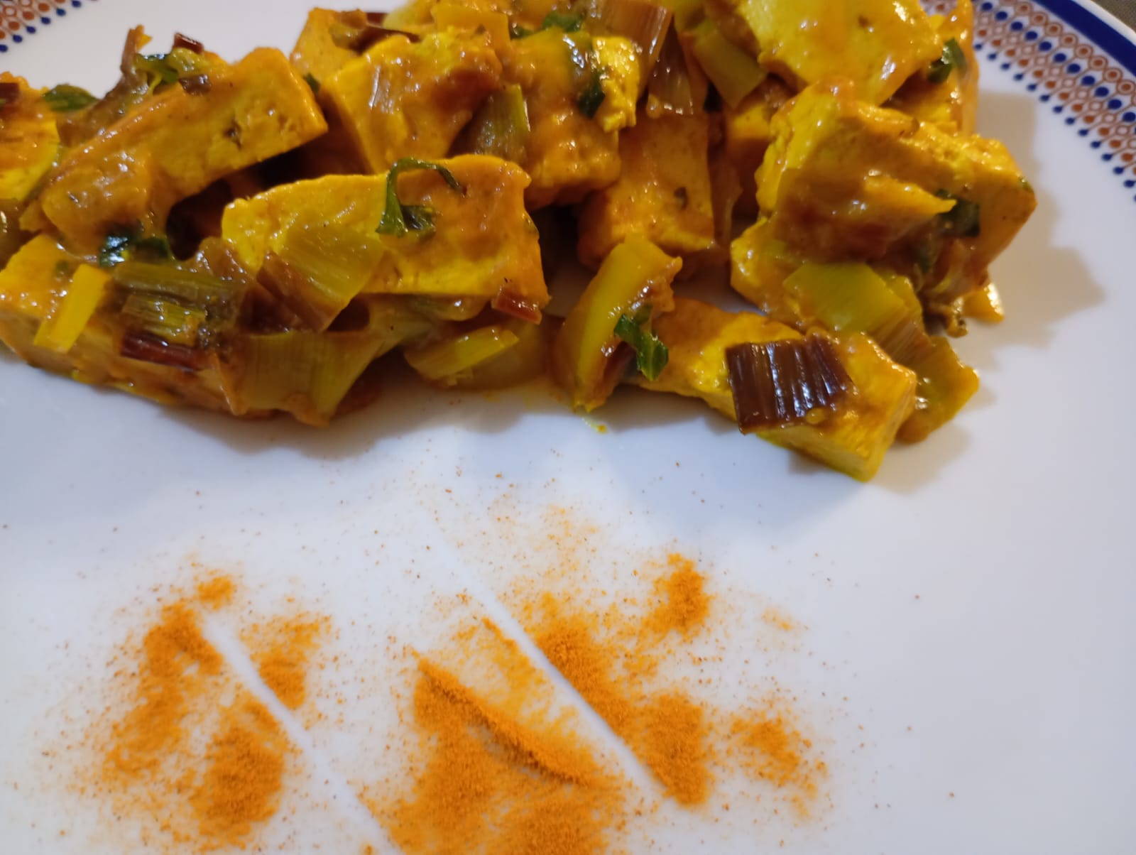 Nella padella o tegame, (evitate materiali antiaderente) mettete i 4 cucchiai di olio extra vergine di oliva, il porro a rondelle, aggiungete l’aglio, la curcuma con un pizzico di pepe, la polvere di zenzero, mescolate, aggiungete il tofu che avrete tagliato prima a dadolini, aggiungete 2 cucchiai di farina di riso e mescolate con 2 bicchieri di acqua.