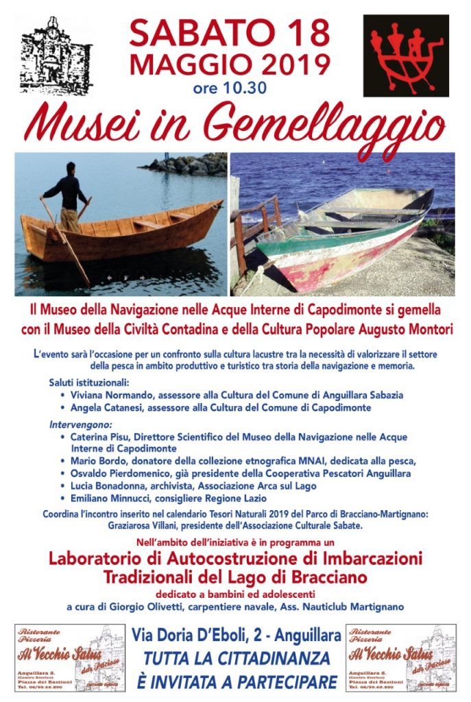 Due Musei e con essi due laghi in gemellaggio sabato 18 maggio ad Anguillara nell’ambito dell’iniziativa “Musei in Gemellaggio” organizzata dall’Associazione Culturale Sabate nell’ambito del calendario di manifestazioni Tesori Naturali organizzato dal Parco regionale Bracciano-Martignano. Ad unirsi in gemellaggio saranno il Museo della Navigazione nelle Acque Interne di Capodimonte sul lago di Bolsena ed il Museo della Civiltà Contadina e della Cultura Popolare “Augusto Montori” di Anguillara sul lago di Bracciano. A fare da filo conduttore la cultura lacustre che accomuna i due territori e che soffre e vive delle stesse problematiche. Entrambe le strutture museale custodiscono elementi della memoria di un mestiere antico quanto il mondo quale quello del pescatore. Una attività che a livello professionale, almeno sul lago di Bracciano, ha necessità di essere valorizzata al meglio, considerato anche il recente passaggio di competenze dalla ex Provincia di Roma, oggi Città Metropolitana di Roma Capitale, alla Regione Lazio.