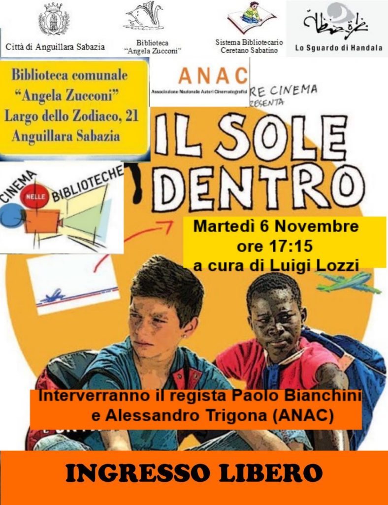 La biblioteca comunale “Angela Zucconi” e l’associazione “Lo sguardo di Handala”, nell’ambito dell’iniziativa “Cinema nelle biblioteche” curata dall’ANAC propone per oggi 6 novembre alle ore 17.15 la proiezione di “Il Sole Dentro” diretto dal regista Paolo Bianchini. La biblioteca di Anguillara ha avuto il privilegio di essere stata scelta tra le poche nel Lazio per presentare al pubblico in anteprima alcuni film ‘invisibili’ che hanno avuto una fugace apparizione nelle sale, realizzati da autori italiani emergenti, e che si distinguono per qualità artistiche. A presentare al pubblico di Anguillara Sabazia “Il Sole Dentro”, sarà lo stesso regista Paolo Bianchini, accompagnato da Alessandro Trigona, in rappresentanza Associazione Nazionale Autori Cinematografici, che ha ideato l’iniziativa. Il film, tratto dalla vera storia di Yaguine Koita e Fodè Tounkara e premiato al Giffoni Film Festival, è particolarmente adatto ad un pubblico di giovani per la sua tematica volta a far comprendere un problema così “caldo” e dibattuto ai giorni nostri com’è quello dell’IMMIGRAZIONE. Quella di oggi è la terzo incontro della rassegna avviata con la proiezione del fim Balon di Pasquale Scimeca e proseguita il 25 ottobre con il fil . Proiezione, accoglienza degli ospiti e moderazione del dibattito sono a cura di Luigi Lozzi. L’incontro è a ingresso libero.