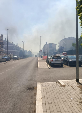Figura 4- Via Anguillarese ore 11.00 del 28-6-2025, il fumo dell’incendio partito dal sito del biodigestore ed arrivato alle prime case di Osteria Nuova, dopo aver superato l’Arrone, invade la zona nei pressi dell’ingresso della scuola e dell’asilo nido.