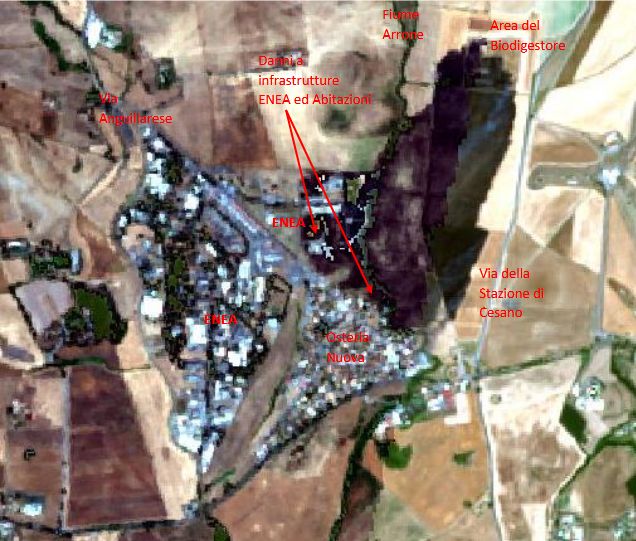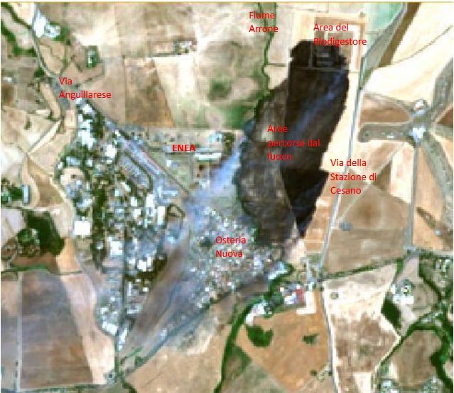 Nell’immagine di Fig. 1, ripresa dal satellite Sentinel 2 dell’ESA (European Space Agency) alle ore 10 dello stesso giorno, si evidenzia quanto detto, con l’inizio dell’incendio dal sito del biodigestore e l’estensione delle fiamme per decine di ettari dei terreni tra l’Arrone e via della Stazione di Cesano (area annerita sull’immagine).