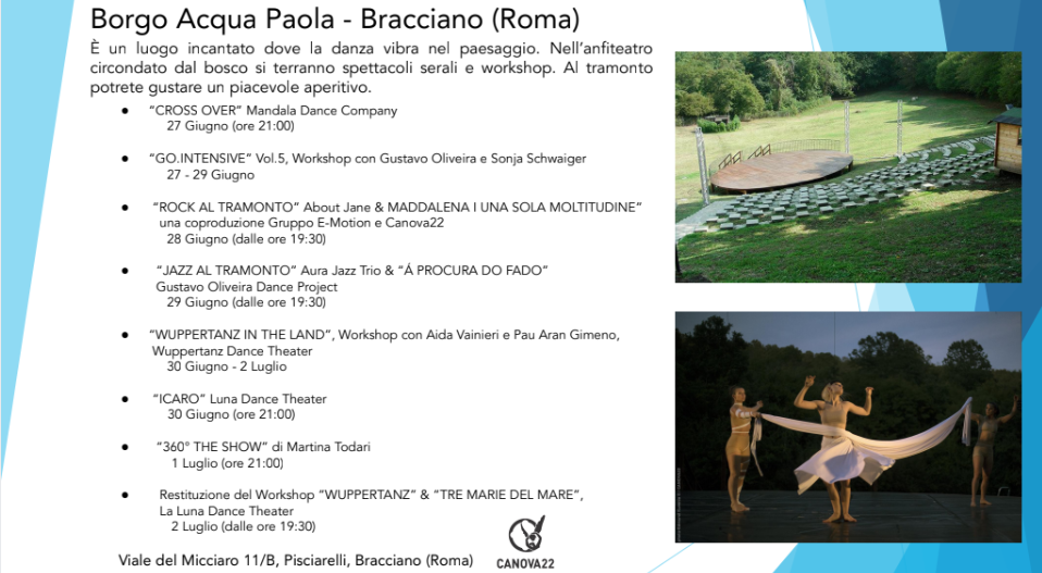 Dal 27 giugno al 2 luglio si sposta appena fuori Roma, nell’Anfiteatro del Borgo Acqua Paola a Bracciano, per danzare sotto la luna in una valle circondata dal bosco. Il 28 giugno sul palco la seconda messa in scena della trilogia “Maddalene” con “Maddalena – Una sola moltitudine”, una coproduzione da Gruppo E-Motion e Canova22 con Maria Borgese e Francesca La Cava, musiche dal vivo del gruppo rock About Jane. Replica a Roma a Valle Giulia il 6 Luglio.