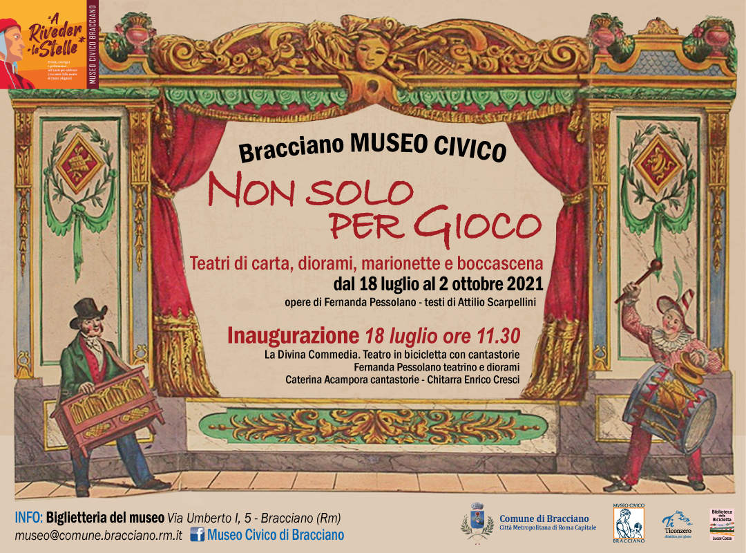 La mostra si inaugura domenica 18 luglio alle 11.30 nel Museo civico di Bracciano, via Umberto I 5, con il Teatro in bicicletta: le opere e il teatrino di Fernanda Pessolano, la cantastorie Caterina Acampora e il musicista Enrico Cresci in una narrazione per bambini dedicata alla Divina Commedia nei 700 anni dalla morte di Dante Alighieri. La mostra, promossa dall’amministrazione comunale, rimarrà aperta fino al 2 ottobre.