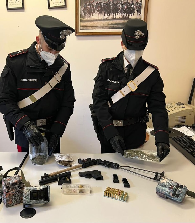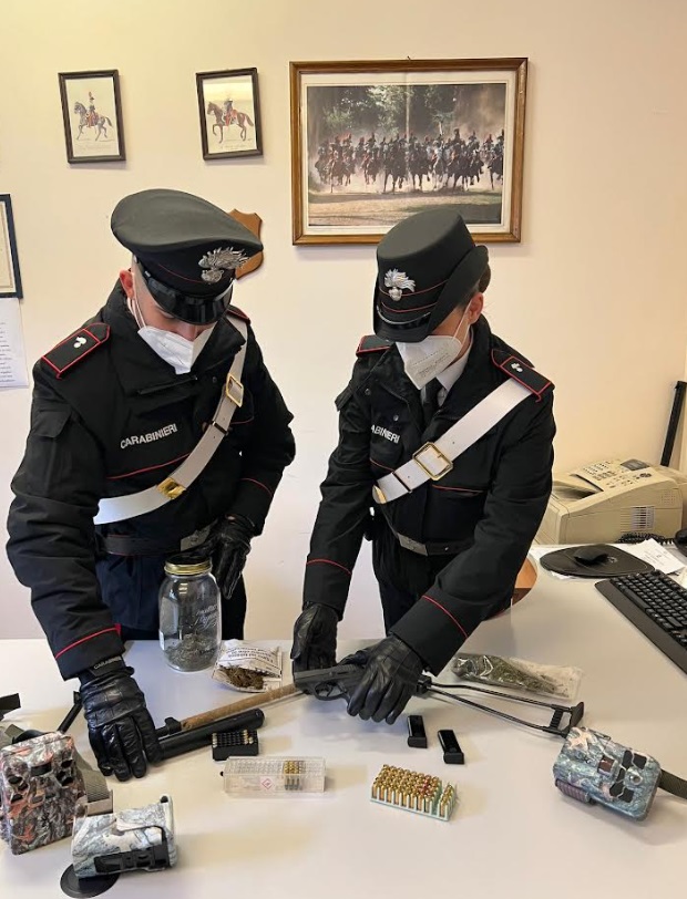 I Carabinieri hanno eseguito successivamente una perquisizione domiciliare rinvenendo, oltre a un silenziatore per fucile illegalmente detenuto e a foto-trappole oggetto di precedenti furti, anche 48 grammi di marijuana.