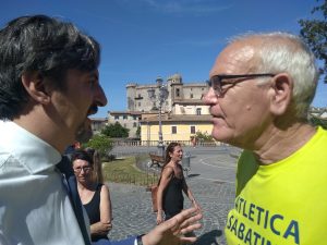 In molti alzano gli occhi al cielo, certi che il sindaco non si farà sfuggire l’occasione del balcone. In piazza tanti bambini in maglia rossa sponsorizzata tirano calci ad un pallone. L’unica ombra della piazza raccoglie centinaia di braccianesi venuti a rivendicare il diritto allo sport. Il vociare monta, finché, il duo scende. Tondinelli e Testini appaiono sulla porta, in camicia. In piazza oggi tanti carabinieri. Dietro di loro il maresciallo della stazione D’Eusebio. Alla vista del sindaco il vociare monta, grida frammiste a fischi. Sono disponibile dice il sindaco, venite su ne parliamo. Ma la piazza non ci sta. Il confronto deve avvenire davanti a tutti. Così poco dopo il sindaco riscende e carte alla mano sbandiera il famoso bando tanto contestato.