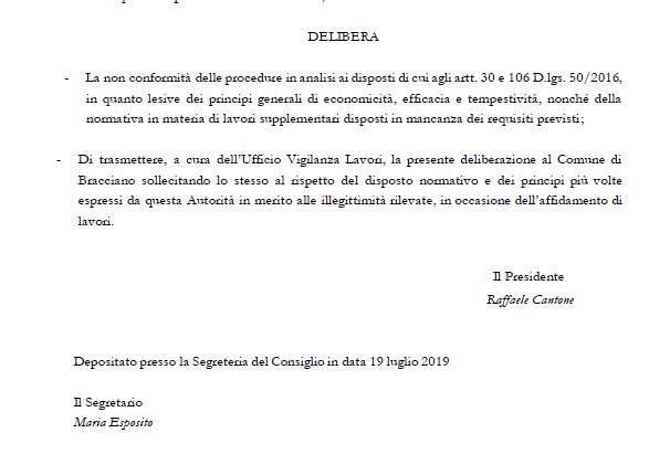 Il giorno 24 luglio ’19, l’Ufficio Vigilanza Lavori dell’Autorità Nazionale Anticorruzione, comunicava ai Consiglieri che è stata pubblicata l’istruttoria condotta dal Consiglio dell’Autorità con Delibera n.637, dove definisce: “La non conformità delle procedure in analisi ai disposti di cui agli artt. 30 e 106 D.lgs. 50/2016, in quanto lesive dei principi generali di economicità, efficacia e tempestività, nonché della normativa in materia di lavori supplementari disposti in mancanza dei requisiti previsti”. Sollecitando il Comune di Bracciano al rispetto del disposto normativo e dei principi più volte espressi da questa Autorità in merito alle illegittimità rilevate, in occasione dell’affidamento di lavori”.