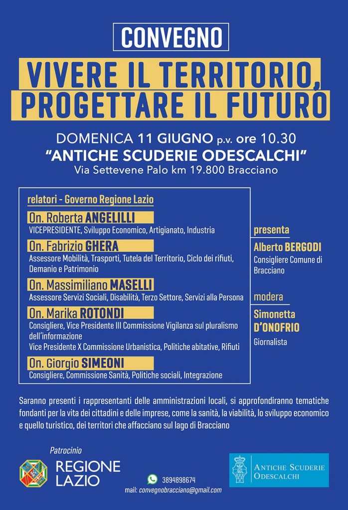 Sanità, viabilità, sviluppo economico e turistico dei territori che si affacciano sul lago di Bracciano, sono questi i temi che saranno affrontati al convegno, “VIVERE IL TERRITORIO, PROGETTARE IL FUTURO”, che si terrà domenica 11 giugno, ore 10:30, nella prestigiosa dimora storica “Antiche Scuderie Odescalchi”, immersa nel verde della campagna romana, in prossimità del Lago di Bracciano.