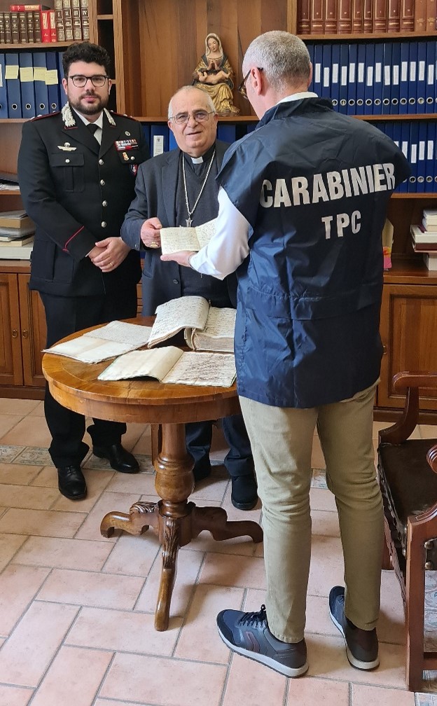 • il sequestro, e successiva restituzione, di tre importanti manoscritti antichi di elevato interesse culturale, asportati illecitamente dall’Archivio Diocesano della Diocesi di Sabina-Poggio Mirteto, databili tra il 1400 ed il 1700, individuati presso le abitazioni di un ex commerciante di libri antichi della capitale e di un privato cittadino residente in Firenze che aveva acquistato uno dei tre volumi su un noto sito di e-commerce. Di fondamentale supporto alle investigazioni si sono rivelati gli elementi descrittivi e fotografici presenti nella “Banca dati dei beni culturali illecitamente sottratti”, gestita dal Comando Carabinieri Tutela Patrimonio Culturale, ove sono confluiti i documenti prodotti in sede di denuncia e le immagini relative ai beni rubati.