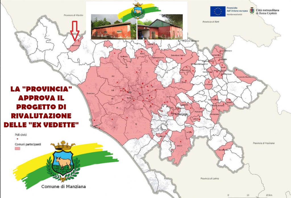 Con decreto del Sindaco della Città Metropolitana di Roma Capitale, trasmesso agli uffici comunali, è stato approvato il progetto presentato dal Comune di Manziana per la valorizzazione dell’area delle ex vedette, zona del paese tra Manziana e Quadroni che in passato ha ospitato delle caserme e che per anni è stata letteralmente abbandonata a sé stessa.