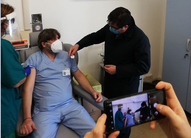 Mauro Negretti coordinatore infermieristico è il primo al qule oggi è stato somministrato il vaccino Covid-19 a Bracciano. Presente alla sua vaccinazione l’assessore regionale alla Sanità Alessio D’Amato in visita al Padre Pio.