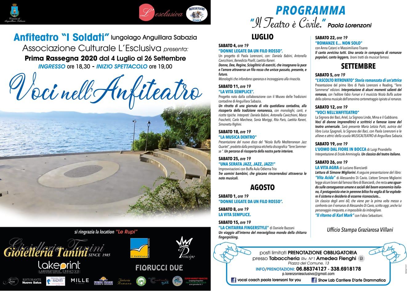 Un teatro di parola che mette insieme in una ampia rassegna attori e attrici tra sperimentazioni e classici del Novecento. Eventi teatrali e musicali in riva al lago nello scenario dei “Soldati” proprio sotto il promontorio di Anguillara luogo già evocativo di per sé. Ad ideare e coordinare l’iniziativa l’attrice Paola Lorenzoni.