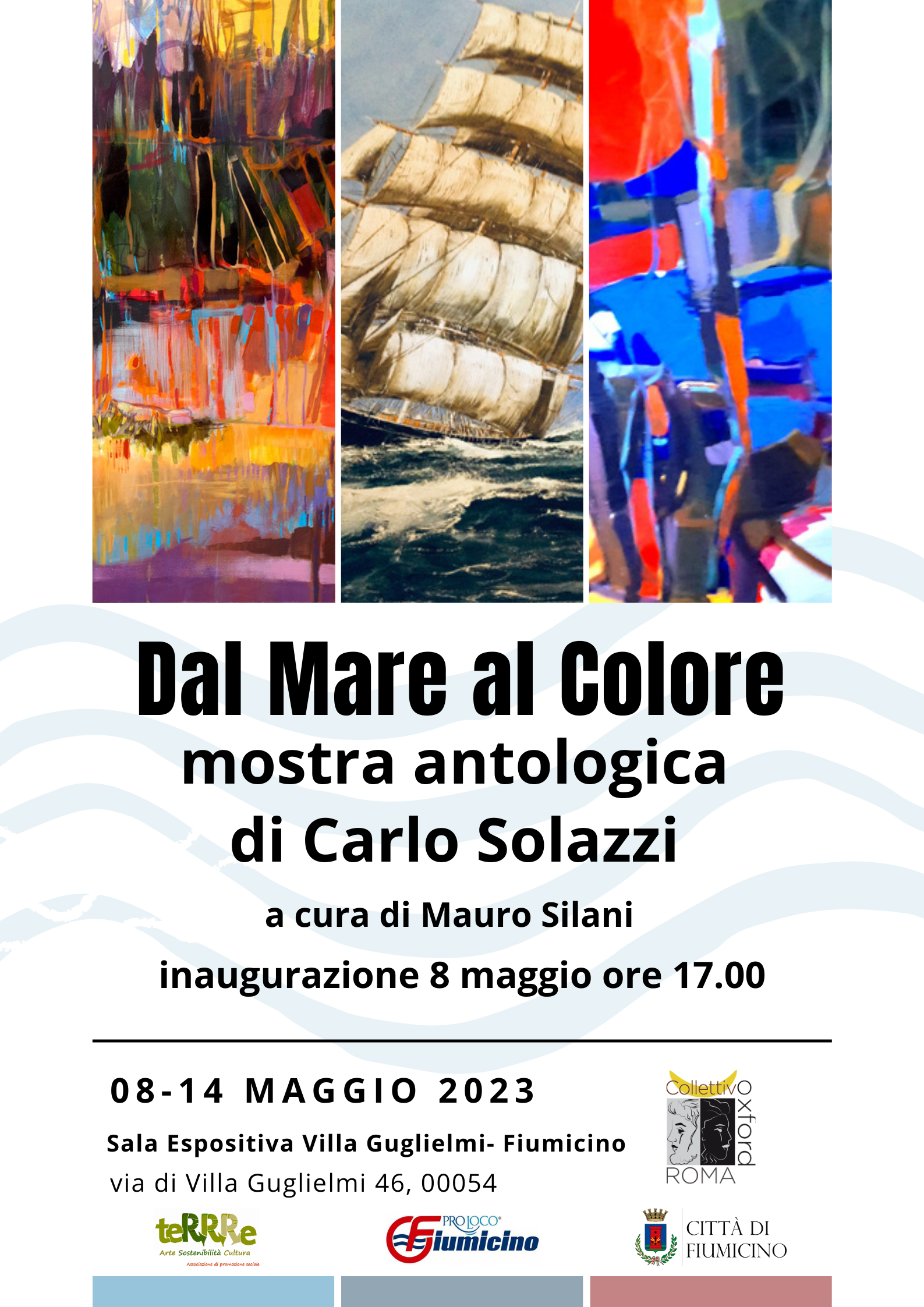 Da lunedì 8 maggio fino a domenica 14 maggio 2023, presso la sala espositiva di Villa Guglielmi a Fiumicino, si terrà la mostra “DAL MARE AL COLORE” antologica dell’artista Carlo Solazzi a cura di Mauro Silani, fondatore e curatore del Collettivo Oxford, promossa dall’Associazione teRRRe Arte Sostenibilità Cultura, svolta con la collaborazione