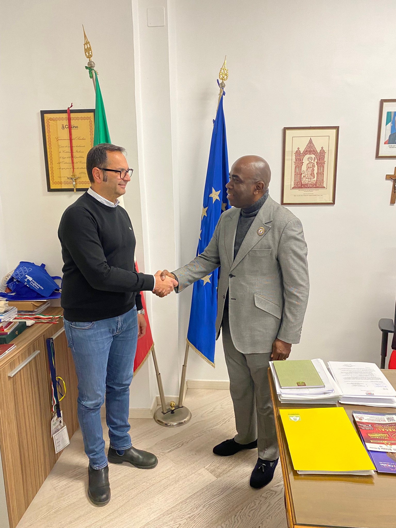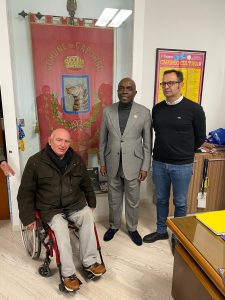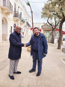 Si consolidano i rapporti tra l’Osservatorio Diplomatico Internazionale e la Repubblica Centraficana. Si è appena conclusa infatti, in provincia di Bari, la visita del dottor Eric Damango che ha potuto incontrare i sindaci di Capurso e di Rutigliano. Dopo l’incontro a Parigi del 14 dicembre nel corso del quale sono stati avviati i primi contatti, a fare gli onori di casa è stato lo stesso presidente dell’ODI Vito Grittani. Giunto in terra pugliese domenica 8 gennaio Damango, presidente della Commissione economica sociale nazionale ed internazionale della Repubblica Centrafricana e corrispondente dell’Osservatorio Diplomatico Internazionale per lo stesso Paese, il 9 gennaio ha incontrato in visita di cortesia il sindaco di Rutigliano Giuseppe Valenzano con il quale si è intrattenuto in un cordiale incontro. Nella stessa giornata Damango ha poi avuto una visita d’obbligo con il sindaco di Capurso Michele Laricchia. Nel corso dell’incontro sono state illustrate le attività appena avviate che prevedono scambi culturali e di solidarietà guardando anche alla valorizzazione delle economie dei territori interessati.