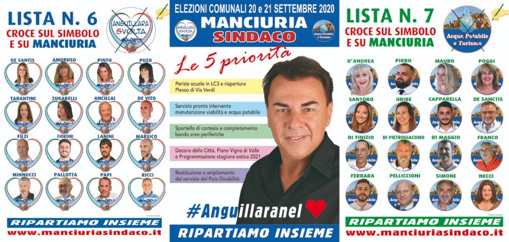 Una famiglia allargata, unita dall’amore per Anguillara, più che una compagine politica. Questa l’atmosfera che si è respirata in una kermesse elettorale al tempo del Covid-19 con tanto di mascherina griffata “Manciuria sindaco” per i candidati. Un discorso semplice, concreto, quello di Manciuria, che ha voluto puntare prima di tutto sulle parole chiave individuate per questa strana campagna elettorale, Competenza, Coraggio e Cuore, e poi sulle cinque priorità che il candidato sindaco si impegna a portare avanti entro il 31 dicembre 2021: 1) Perizie scuole in LC3 e riapertura plesso di Via Verdi in sicurezza statica con conseguente restituzione in danno container in via Duca degli Abruzzi 2) Servizio di pronto intervento di manutenzione viabilità e pozzi h24 ; 3) Sportello di cortesia e completamento bando aree periferiche; 4) Decoro di Anguillara, Piano Vigna di Valle; 5) Restituzione ed ampliamento del servizio del Polo disabilità.