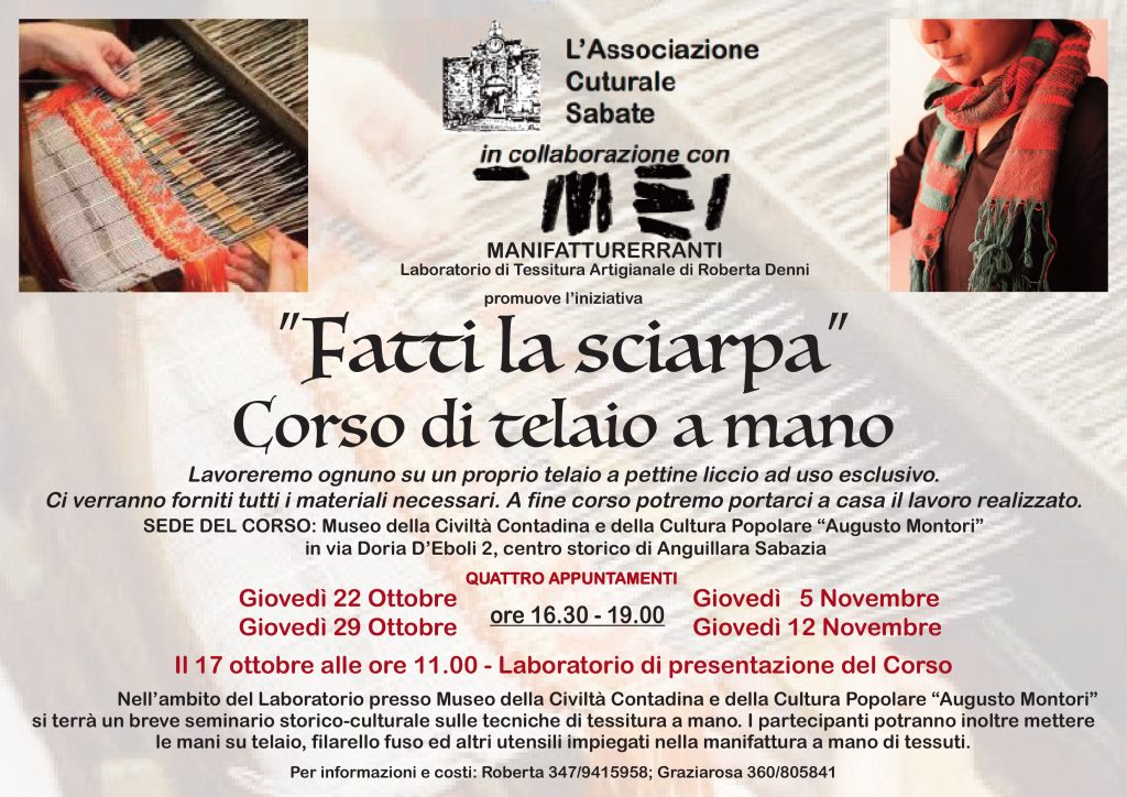 Imparare le tecniche della tessitura a mano. L’Associazione Culturale Sabate che opera dal 1992 per la rivalutazione della tradizione è lieta di annunciare l’avvio del corso “Fatti la sciarpa”. Una opportunità da non perdere per avvicinarsi all’affascinante mondo della tessitura, del fatto a mano, secondo procedure tramandate da persona a persona. Il corso, articolato in quattro appuntamenti il giovedì, è organizzato in collaborazione con Manifatturerranti. Roberta Denni accompagnerà i partecipanti nella realizzazione di un proprio manufatto e non solo. Si sta valutando inoltre l’opportunità di proporre il corso anche il venerdì mattina nella stessa sede.