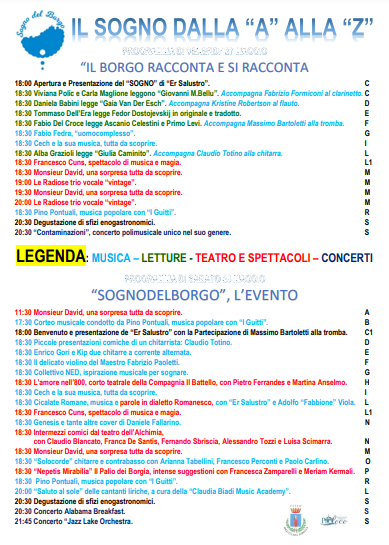 E’ importante dire che Sogno nel Borgo è un contenitore che va riempito di iniziative. Tutti coloro che vogliono partecipare, suggerire e proporre anche, diciamo, arte già confezionata troveranno con noi una spalla forte su cui appoggiarsi. Questo è quello che noi ci proponiamo e ci auguriamo che la cittadinanza e le istituzioni capiscano il buon intento e collaborino e ci aiutino.