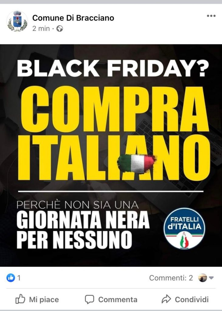 minuti sulla pagina ufficiale Facebook del Comune di Bracciano. L’indignazione per un post di tale portata sul sito istituzionale ha fatto il giro suscitando viva indignazione. Una eco che deve essere giunta al destinatario tant’è che il post è stato rimosso e subito dopo sono comparse delle scuse. Il post di scuse non riporta alcuna firma. Il sindaco Tondinelli è un esponente di Fratelli d’Italia. La vicenda, subito rientrata, evidenzia una confusione, almeno nei ruoli. Non è dato sapere chi gestisce la pagina Facebook, se il sindaco in prima persona, se il suo vice o chi altro. Certo è che il Comune di Bracciano, dopo aver cacciato un giornalista professionista che ora li ha citati in giudizio, già incaricato di curare l’Ufficio Stampa, sborsa decine di migliaia di euro per una fantomatica “promozione territorio, attraverso la sperimentazione di forme alternative di servizi culturali, turistici e commerciali” su Radio Radio Radio Media S.r.l. Peraltro l’avvocato Michetti, già in organico nella Radio, ha ricevuto recentissimamente l’incarico di difendere il Comune nella vertenza sollevata dal giornalista cacciato in malo modo trovando il modo di incamerare altri soldi. Con tutte queste spese il sindaco o chi per lui avrebbe forse potuto pagare un addetto specifico affinché curasse la pagina social. Un tale grossolano errore, imputabile probabilmente ad un click di troppo, non sarebbe accaduto.