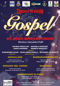 L’energia del gospel per le Festività natalizie 2019. Quattro i concerti per la stagione di fine anno dei St John’s Singers, costola dell’Associazione Il Cantiere dell’Arte di Manziana. Ancora una volta il coro – uno dei pochi che può vantare una ormai ultraventennale collaborazione con vocalist di fama d’oltreoceano, uno fra tutti Harold Bradley – propone brani della tradizione spiritual e un repertorio rinnovato riuscendo in ogni esibizione a conquistare il consenso del pubblico e della critica.