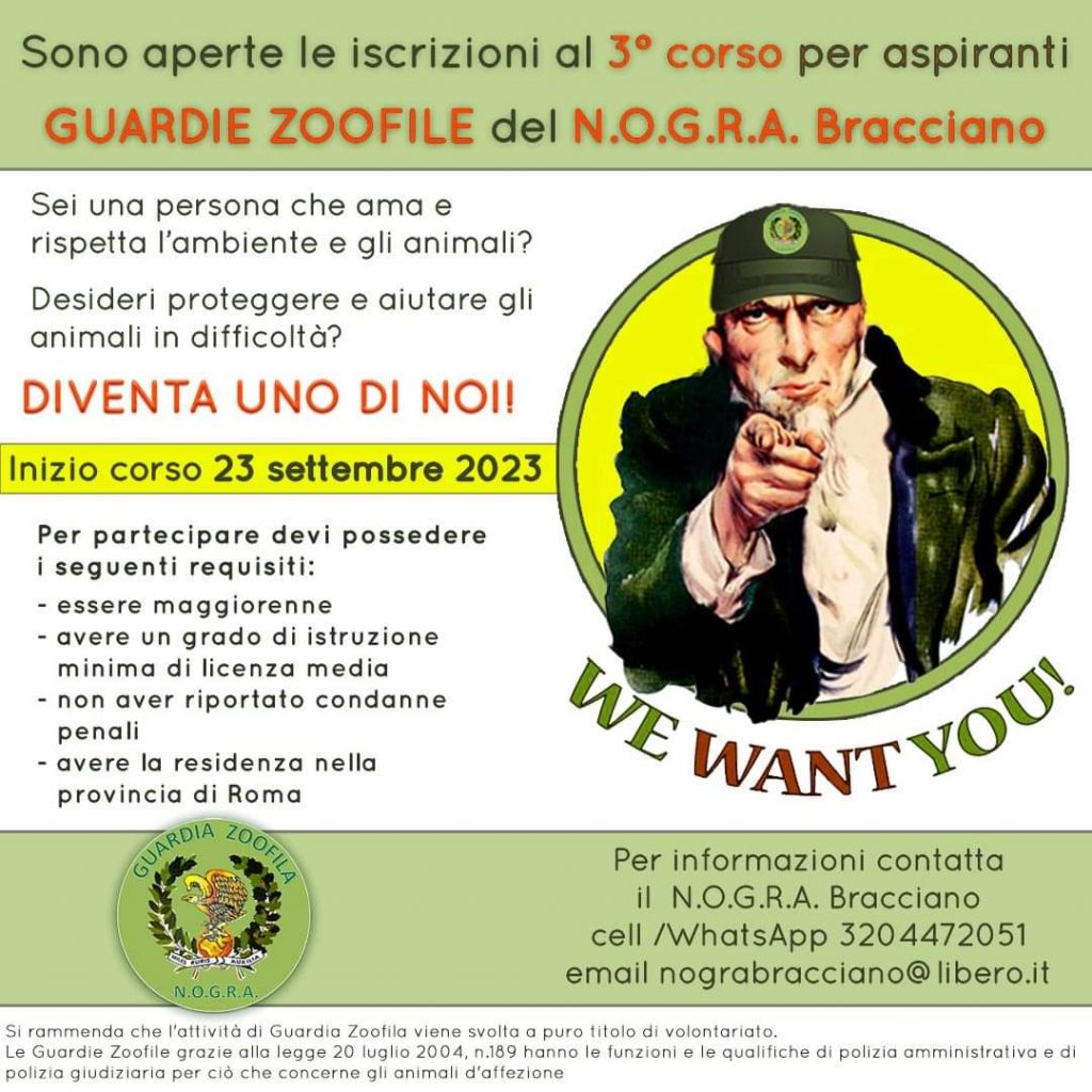 La guardie zoofile del N.O.G.R.A. Bracciano sono pubblici ufficiali ed agenti di polizia giudiziaria che effettuano attività di tutela, controllo e repressione degli illeciti e dei reati verso animali. Il servizio a cui sono destinate è stabilito dalla legge 189/2004, dalle ordinanze ministeriali, dai regolamenti e nello specifico riguarda la protezione degli animali e la tutela del patrimonio zootecnico. I verbali redatti dalle guardie zoofile, quali pubblici ufficiali, hanno forza di atto pubblico e costituiscono prova in giudizio fino a querela di falso. L’inizio del corso è fissato per il 23 settembre 2023.