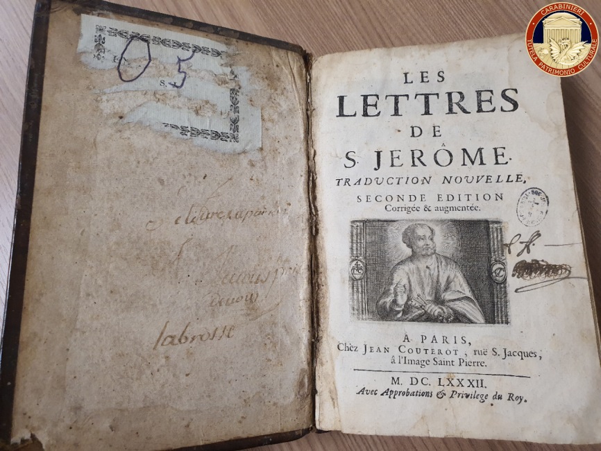 Il volume del Seicento in lingua francese dal titolo “Les lettres de S. Jerome”, ristampa del 1682 degli scritti di carattere dottrinale-religioso di San Girolamo, è stato consegnato a Padre Raul Pablo Gonzalez Bernardi, Direttore della Biblioteca “Peter – Hans Kolvenbach” della Curia Generalizia dell’Ordine dei Gesuiti di Roma, dai Carabinieri del Nucleo per la Tutela del Patrimonio Culturale (TPC) di Udine, al comando del Maggiore Lorenzo Pella.