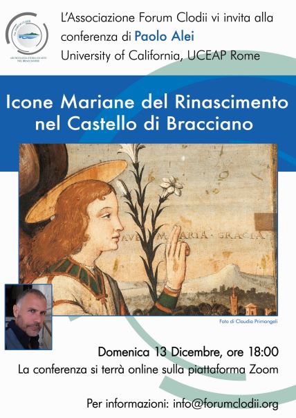 Per iniziativa dell’Associazione Forum Clodii domenica 13 dicembre alle 18 su Zoom al link https://us02web.zoom.us/j/87187881550… (meeting ID: 871 8788 1550, passcode: 658017) si tiene la conferenza online “Icone Mariane del Rinascimento nel Castello di Bracciano”.