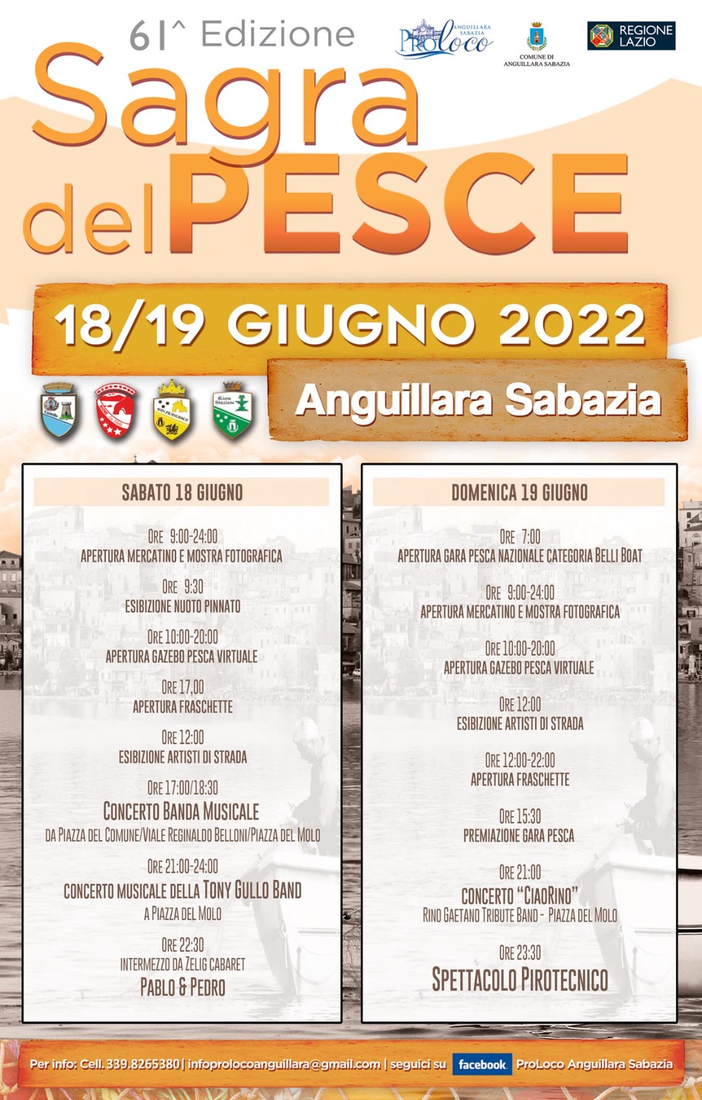 Attesa 61^ Sagra del Pesce ad Anguillara sabato 18 e domenica 19 giugno. La manifestazione è organizzata dalla Pro Loco Anguillara, dal Comune di Anguillara con il contributo della Regione Lazio.