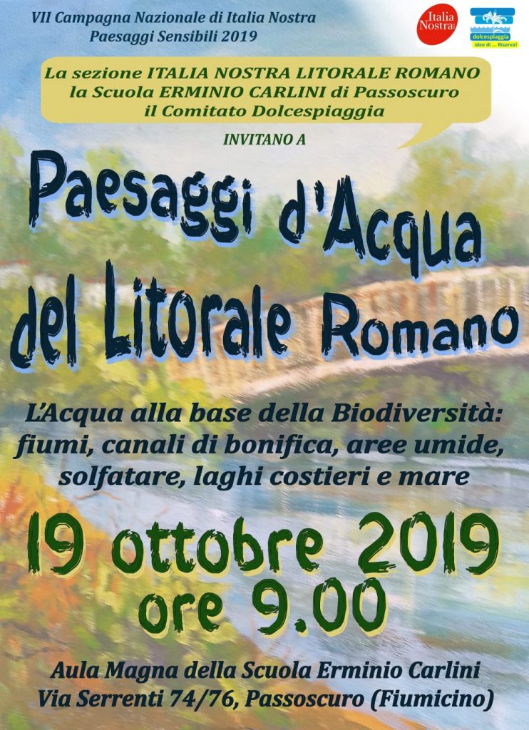 Nell’ambito della VII Campagna Nazionale Di Italia Nostra Paesaggi Sensibili la sezione Litorale Romano di Italia Nostra e l’associazione Dolcespiaccia promuovono per sabato 19 ottobre alle 9 presso l’Aula Magna della Scuola “Erminio Carlini” (Via Serrenti 74/76) di Fiumicino il convegno “Paesaggi D’acqua del Litorare Romano”.