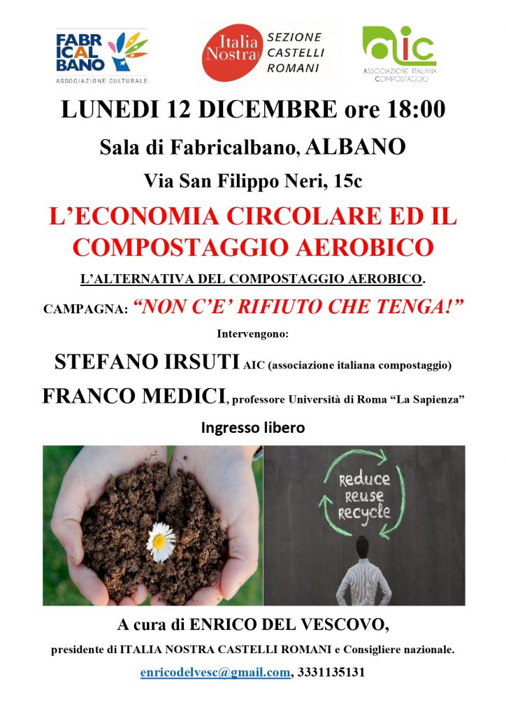 Lunedi 12 dicembre ore 18:00 presso la sala dell’associazione culturale Fabricalbano, in Via S. Filippo Neri 15c ad Albano. Nell’incontro si dimostra come le alternative alle discariche ed inceneritori in realtà ci sono e basterebbe che ci fosse la volontà politica per attuarle oltre all’impegno e sensibilità dei cittadini. Il compostaggio aerobico in tal senso rappresenta una soluzione naturale, semplice, economica e con nessun impatto ambientale, ma questa pratica ancora non ha trovato adeguata diffusione. Italia Nostra sezione Castelli Romani sta promuovendo la campagna “NON C’E’ RIFIUTO CHE TENGA! “ a sostegno del compostaggio in collaborazione con l’Associazione Italiana Compostaggio. La cittadinanza, gli amministratori pubblici e le società che gestiscono la raccolta rifiuti sono invitate a partecipare e discutere insieme. Tra l’altro Italia Nostra Castelli Romani ricorda anche che un bando della Regione Lazio, risalente al 2017, sta ora per scadere senza che molti comuni abbiano fatto alcunché, vanificando quindi gli sforzi fatti per diffondere l’alternativa del compostaggio.