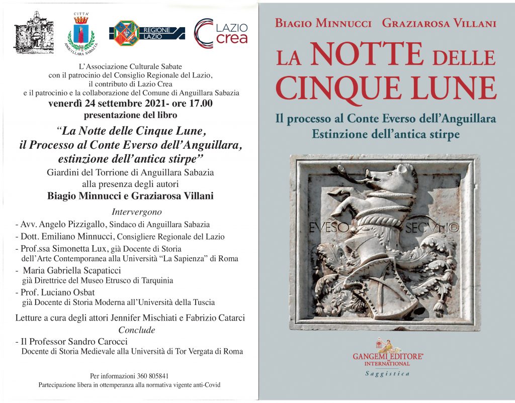 Ne “La Notte delle Cinque Lune, il processo al Conte Everso dell’Anguillara, estinzione dell’antica stirpe”, gli autori Biagio Minnucci e Graziarosa Villani, costruiscono un romanzo storico che ritrae il personaggio e la sua famiglia fin dai tempi della leggenda della sconfitta del drago di Malagrotta posta all’origine della stirpe, e lo consegnano al lettore con tutte le sue vanità e con tutte le sue debolezze in una sorta di dramma storico in cui potersi identificare.