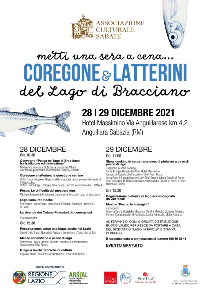 Nasce per la promozione al consumo del pesce del lago di Bracciano l’iniziativa “Metti una sera a cena…coregone e latterini del lago di Bracciano” in programma, con il contributo di Regione Lazio-Arsial, il 28 e il 29 dicembre ad Anguillara Sabazia. L’Associazione Culturale Sabate, attiva da 30 anni sul territorio del lago con attività culturali anche con la gestione del proprio Museo della Civiltà Contadina e della Cultura Popolare “Augusto Montori”, intende con la due giorni porre al centro della discussione il ruolo dei pescatori di professione sul lago di Bracciano, una categoria a rischio di estinzione, e la valorizzazione del pescato lacustre da ogni punto di vista. La due giorni si articola con il convegno il 28 dicembre alle 10.30 sul tema “Pesca nel lago di Bracciano tra tradizione ed innovazione” al quale prenderanno parte biologi, ecologi ed esperti del settore e in una giornata di show cooking, nel corso della quale, cinque chef promuoveranno le proprie ricette a base di pesce del lago di Bracciano. Il coregone e il latterino sono inseriti quali prodotti tipici del Lazio nella pubblicazione Arsial “Lazio patrimonio agroalimentare tra biodiversità e tradizione”.