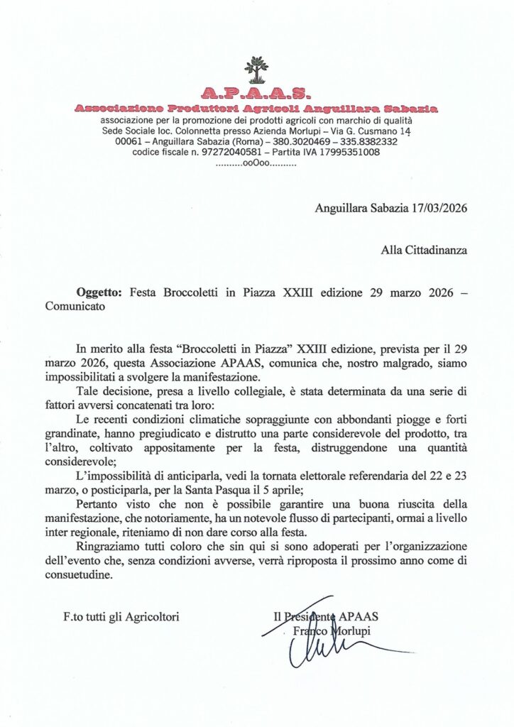 Con una nota il presidente dell’Associazione Produttori Agricoli Anguillara Sabazia Franco Morlupi comunica l’annullamento della Festa Broccoletti in Piazza che era in programma per il 29 marzo. Il broccoletto è uno dei prodotti tipici di Anguillara e la festa annuale che lo celebra è di grandissimo richiamo.