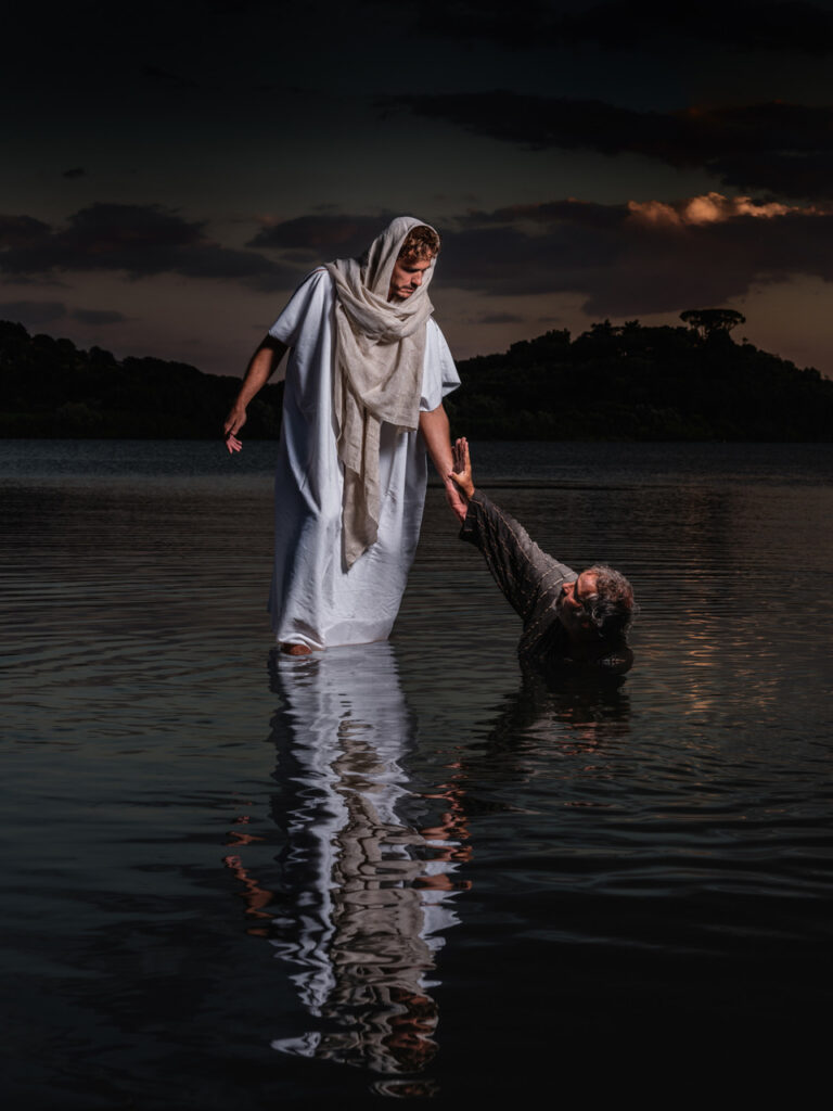 Aqua è in ordine cronologico la quinta opera basata sulla rievocazione storica e la quarta inerente la vita di Gesù, così come è narrata nei Vangeli. Nello specifico, narra di due eventi della vita di Gesù. Il miracolo della camminata sulle acque del lago Tiberiade e il battesimo nel fiume Giordano. L’ambientazione perfetta l’abbiamo individuata a Trevignano. Proprio la vicinanza della location ha permesso di realizzare tutti gli scatti in una sola sessione fotografica. Già… la pianificazione. Arrivare pronti e con le idee chiare sul set ci ha permesso di preparare in anticipo i costumi di scena più consoni, decidere quale illuminazione utilizzare e avere un’idea precisa di come realizzare le fotografie… compreso il miracolo di far camminare sulle acque una persona senza ricorrere alla computer grafica.