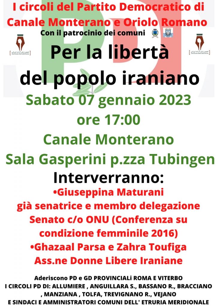 Il 7 gennaio alle 17 nella sala Gasperini in piazza Tubingen a Canale Monterano in programma l’incontro “Per la libertà del popolo iraniano”. L’iniziativa è organizzata dal Pd di Canale Monterano e di Oriolo Romano con l’adesione degli altri circoli del territorio. Interventi dell’ex senatrice Maturani e di esponenti dell’Associazione Donne Libere Iraniane,