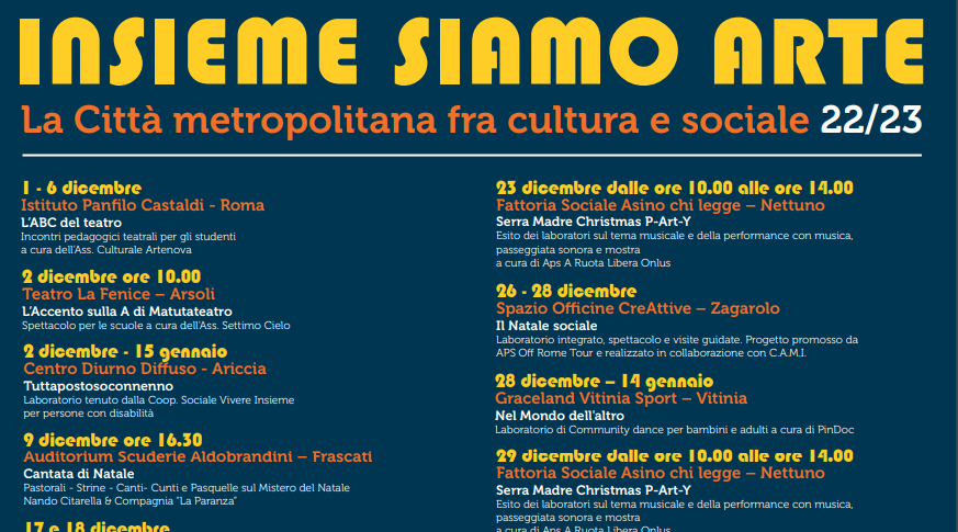 Ha preso l’avvio ad inizio dicembre il progetto Insieme siamo arte. La Città metropolitana fra cultura e sociale con una serie di attività tra laboratori, spettacoli, concerti, presentazioni di libri, cortometraggi nato dalla collaborazione tra Città metropolitana di Roma Capitale e ATCL Circuito Multidisciplinare del Lazio, sostenuto da MIC – Ministero della cultura e Regione Lazio. Una proposta multidisciplinare che si estenderà, in questa sua prima edizione fino al 15 gennaio anche in realtà che richiedono interventi di lunga durata per sedimentare lo spettacolo quale strumento di coesione sociale. È in certi casi l’inizio, in altri il proseguimento di un lavoro di realtà ben radicate nei territori in cui operano con soggetti svantaggiati o con disabili, il cui esito non è immediatamente riscontrabile nella capacità di riempire una sala, quanto nella tipologia di intervento, nel rendere le arti sceniche elemento di relazione tra le persone, qualunque sia la loro condizione, per una ritrovata identità territoriale e di coesione dei sistemi sociali. Il progetto vuole cominciare a realizzare un modello integrato di offerta culturale, al di fuori dei contesti tradizionali di fruizione, per far comprendere quanto le arti dello spettacolo siano compenetrate nel vissuto quotidiano. È questa la funzione del teatro sociale di comunità e degli interventi che tendono a ricostruire l’identità di un territorio e della sua collettività.