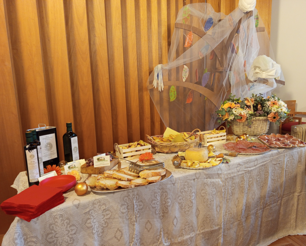 Ad ogni partecipante è stato fatto dono di un bouquet di fiori ed un cestino di prodotti tipici della Tuscia, della società Dialmar. Oltre ai prodotti viterbesi, sono stati offerti in degustazione prodotti del territorio sabino, con il contributo di aziende locali: Azienda agricola Montepiano-Lavandeto, Pasta fresca artigianale, il Birrificio artigianale Cowbridge, l’Azienda agricola biologica Canali, l’azienda agricola biologica Mercuri, l’Azienda agricola Ever Green Sabina, il forno pasticceria artigianale Dolce Sabina, l’azienda Stefano Facioni di Poggio Mirteto e il Forno Anvedi che bontà di Forano, tra ricette e prodotti tipici a Km0, olio EVO e agricoltura biologica e grano antico. Allestimento in collaborazione con Chiara Fanciulli events.