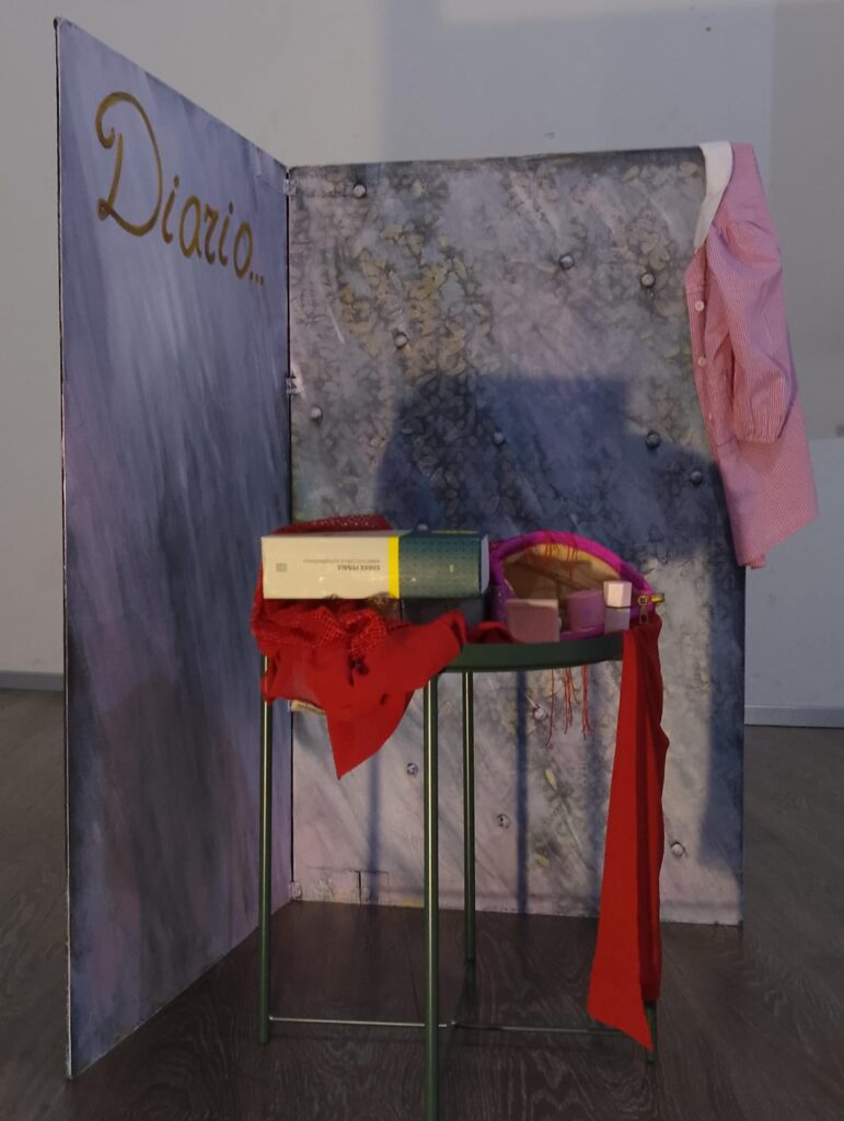 L’installazione scenica che prevede una interazione con il linguaggio del corpo, rappresenta il Diario di una donna.