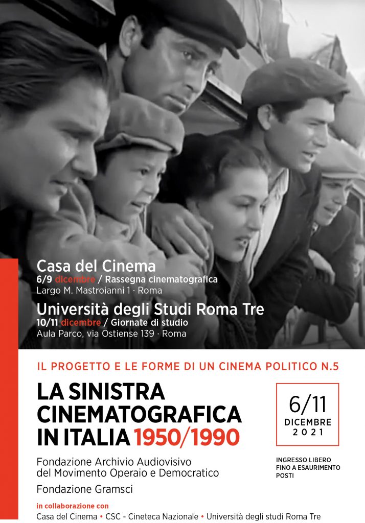 | Rassegna cinematografica e incontri 6 / 9 dicembre 2021 Casa del Cinema. Largo Marcello Mastroianni 1 – Roma Giornate di studio 10/11 dicembre 2021 Università degli Studi Roma Tre, Aula Parco via Ostiense 139 – Roma Ingresso libero fino ad esaurimento posti Nuovo appuntamento, il quinto, con l’iniziativa “Il progetto e le forme di un cinema politico” curata dal gruppo di studio e lavoro dell’Archivio Audiovisivo del Movimento Operaio e Democratico: La sinistra cinematografica in Italia 1950/1990 è il tema di questa nuova edizione, articolato in una rassegna cinematografica, con incontri e dibattiti alla Casa del Cinema di Roma dal 6 al 9 dicembre e una doppia giornata di studi, in programma il 9 e 10 dicembre, presso l‘Università degli Studi Roma Tre. Dopo aver affrontato quattro edizioni su temi molto impegnativi, quest’anno, anche in occasione dei cento anni dalla nascita del Pci, il gruppo di lavoro ha ritenuto utile riflettere sulle relazioni tra i partiti della sinistra e le loro scelte nel campo della politica culturale – il Partito Comunista e il Partito Socialista in primo luogo – e il mondo del cinema italiano.“ Riflettere sul rapporto – molto stretto – intercorso tra la sinistra e il cinema italiano a partire dagli anni cinquanta significa analizzare una relazione proficua ma anche molto contrastata nei vari passaggi della storia dell’Italia repubblicana, dagli anni duri della “guerra fredda” fino all’autoscioglimento del PCI”: questo il pensiero della squadra di studiosi composta da Dario Cecchi, Marco Maria Gazzano, Antonio Medici, Alma Mileto, Pietro Montani, Claudio Olivieri, Ivelise Perniola, Giovanni Spagnoletti, Ermanno Taviani, Maurizio Zinni, coordinata da Paola Scarnati e con la partecipazione e l’impegno del presidente della Fondazione AAMOD, Vincenzo Vita. L’approccio all’argomento sarà interdisciplinare, a partire, in primo luogo, dai contributi di critici cinematografici e studiosi di cinema, storici, cineasti, testimoni, archivisti che si alterneranno nei quattro giorni di rassegna per presentare e approfondire e dibattere su una accurata selezione di grandi e significativi film del cinema italiano, ma anche opere meno note, documentari di tutti formati e programmi tv innovativi. L’iniziativa vuole rivolgersi non solo a chi già conosce la cinematografia di quel capitolo della storia d’Italia ma anche, in primo luogo, a un pubblico più giovane, come in particolare quello universitario. La sinistra cinematografica in Italia 1950/1990 è un’iniziativa ideata e promossa dall’Archivio Audiovisivo del Movimento Operaio e Democratico e dalla Fondazione Gramsci, con il sostegno del Ministero della Cultura (Direzione Generale Cinema e Audiovisivo) in collaborazione con la Casa del Cinema, il C entro Sperimentale di Cinematografia – Cineteca Nazionale e l’Università degli Studi Roma Tre. Media partner Open DDB e “Il Manifesto”. |
