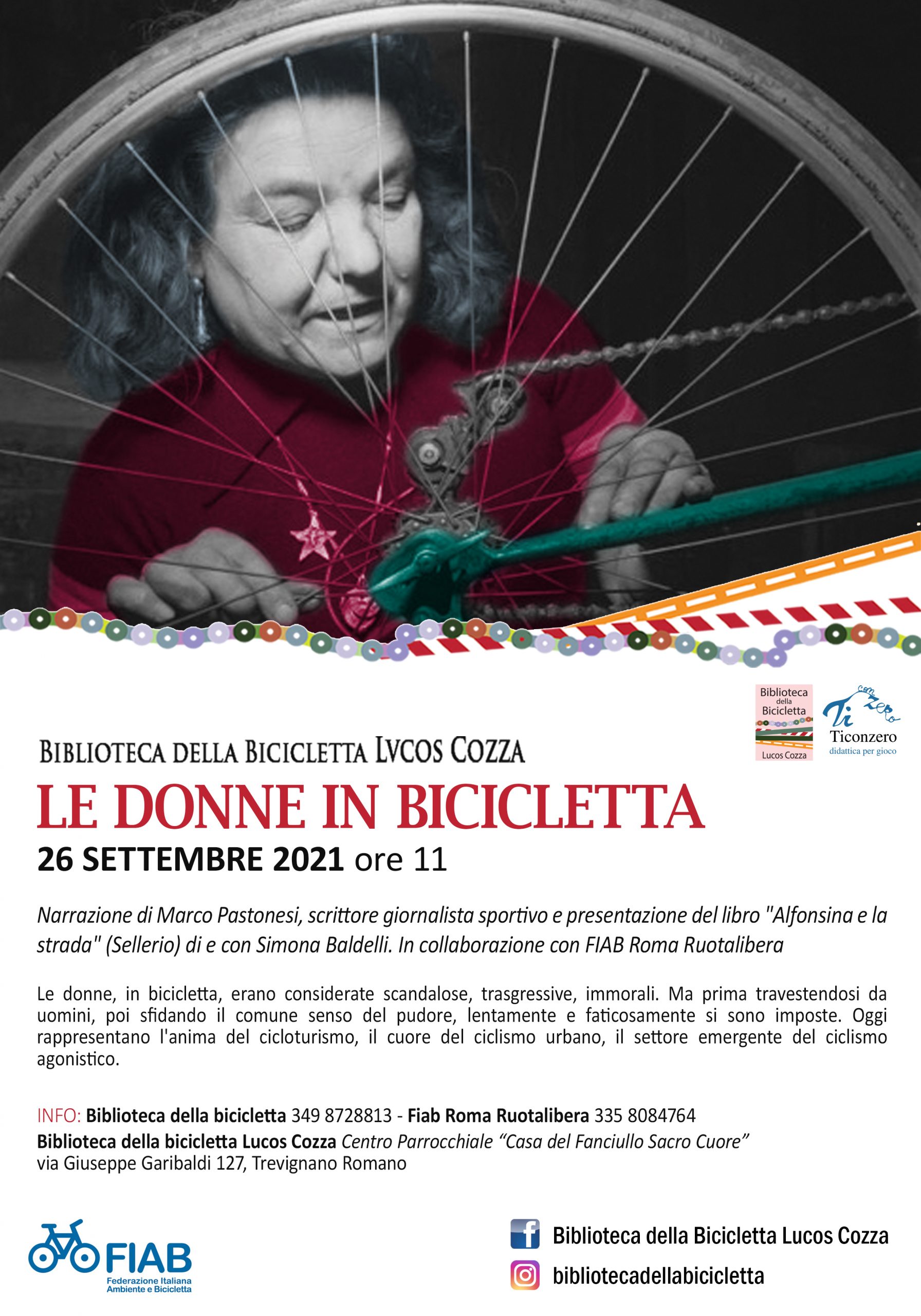 “Le donne in bicicletta” è il tema dell’incontro di domenica 26 settembre, alle 11, nella Biblioteca della bicicletta Lucos Cozza a Trevignano Romano. Una narrazione di Marco Pastonesi, scrittore e giornalista sportivo e la presentazione del libro “Alfonsina e la strada”, di e con Simona Baldelli (Sellerio), in collaborazione con Fiab Roma Ruotalibera. Ingresso libero.