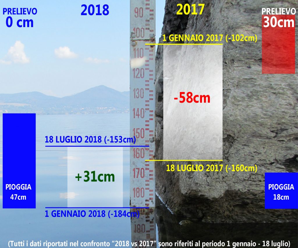 Ancora più evidente la differenza partendo dall’inizio dell’anno: se prendiamo in esame il periodo che va dal 1 gennaio al 18 luglio infatti, nel 2017 il livello del lago era diminuito di 58cm, al contrario, nello stesso periodo del 2018, il livello è aumentato di 31cm.