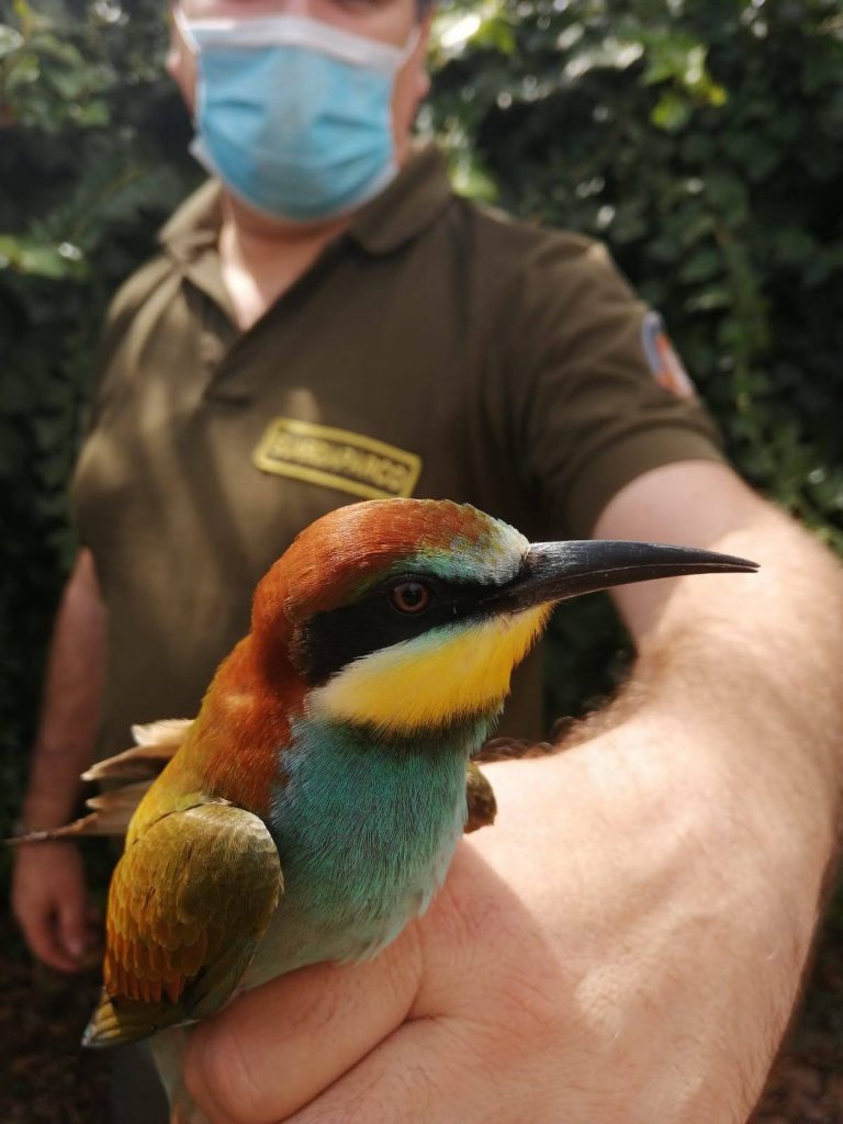 Il 2 settembre è pervenuto alla sede del Parco un Gruccione, con il suo splendido piumaggio coloratissimo e purtroppo con una evidente frattura all’ala sinistra.