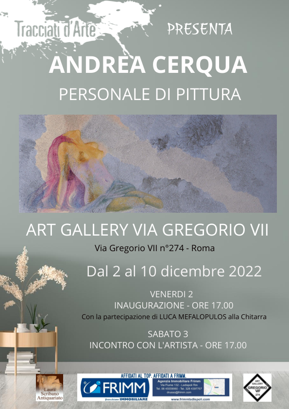 Un nuovo appuntamento targato tracciati d’arte con la mostra personale del suo direttore Andrea Cerqua che esporrà circa 30 opere ad olio in una sua antologica nella galleria di Roma Art Gallery di via Gregorio VII n 274. L’inaugurazione è prevista per venerdì 2 dicembre dalle ore 17:00 e sabato 3 dicembre sempre dalle ore 17:00 un incontro con l’artista e con scrittori e poeti dello staff di Tracciati d’Arte. Siete tutti invitati per una mostra che è un percorso a ritroso nell’arte di Andrea Cerqua dove la discesa dentro il proprio vissuto e le emozioni scandagliate negli anni con la sua pittura si mostrano vive e piene di energia ad un pubblico ormai sempre crescente ed  interessato verso l’arte di Andrea Cerqua. In mostra anche alcune opere in cui l’artista ha usato la sabbia di Ladispoli. Altre opere invece in cui Andrea Cerqua indica tramite le tecniche di rilassamento ed annullamento dei pensieri una strada verso il ricongiungimento con la parte vera di se stessi cioè con il proprio essere libero dal continuo flusso dei pensieri che portano lontano dal proprio centro luminoso. Siete tutti invitati da venerdì 2 dicembre a sabato 10 dicembre alla Art Gallery di via Gregorio VII Roma.