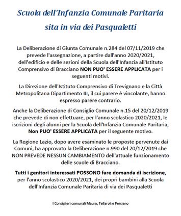 Giovedì 10 gennaio 2020 abbiamo affisso in piazza del Comune il seguente manifesto con il duplice scopo, istituzionale e sociale, di informare la cittadinanza delle decisioni adottate dalla Città Metropolitana e dalla Regione Lazio in merito alla Scuola dell’Infanzia Comunale Paritaria di via dei Pasqualetti.