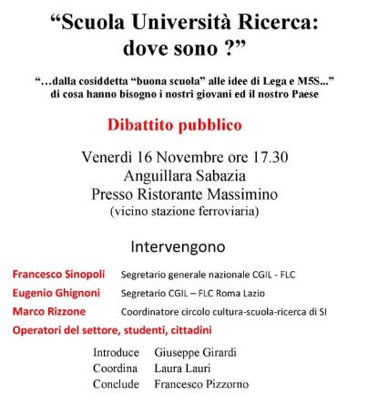 “Domani ad Anguillara si svolgerà un importante incontro sul tema della conoscenza, e più in particolare sulla scuola con riferimenti alle politiche per la ricerca e l’Università. I relatori affronteranno le questioni più generali e gli elementi di crisi di un settore veramente cruciale per la crescita dell’intera società, in un periodo storico dove conoscenze e competenze sembrano via via meno importanti.