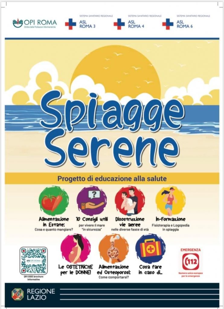 Un progetto di educazione sanitaria e le informazioni per fronteggiare le situazioni di emergenza: il progetto “Spiagge serene” è stato ideato dalle Asl Roma 3, Roma 4 e Roma 6, il cui territorio comprende l’intera costa della Provincia di Roma, con il patrocinio dell’Ordine delle Professioni Infermieristiche di Roma e della Regione Lazio, e porta le iniziative educative direttamente in spiaggia, tra i bagnanti.