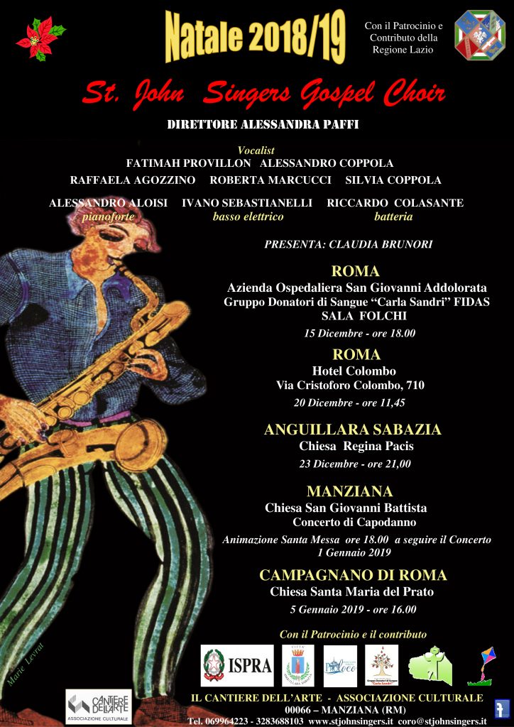 Gospel e Natale, un binomio che ritorna con le festività di fine anno. Ancora una volta i St John’s Singers di Manziana, pionieri dell’importazione dello spiritual-gospel in Italia, tornano protagonisti di una stagione che li vedrà impegnati fino alla vigilia dell’Epifania. La stagione è organizzata con il patrocinio ed il contributo della Regione Lazio. Accanto ad appuntamenti divenuti tradizionali, quali quello di Capodanno a Manziana nella chiesa di San Giovanni Battista e quello a Campagnano di Roma alla chiesa di Santa Maria del Prato il 5 gennaio, quest’anno il coro frutto porterà le sonorità gospel anche in altri luoghi. Significativo l’evento di apertura il 15 dicembre alle 18 all’ospedale San Giovanni Addolorata di Roma su iniziativa del Gruppo Donatori di Sangue “Carla Sandri” Fidas.  Altro appuntamento inedito il 20 Dicembre 2018 alle 11,45 all’Hotel Colombo di Roma su organizzazione dell Istituto Superiore per la Protezione e la Ricerca Ambientale. I St John’s Singers tornano poi ad Anguillara, su invito del Comune, per un evento il 23 Dicembre 2018 alle 21 alla Chiesa Regina Pacis. Un appuntamento nel quale si esibiranno anche i concittadini di Anguillara Paolo Carlorecchio, la brava vocalist Raffaela Agozzino e Romina Callari. Si rinnocano poi gli appuntamenti di Capodanno alla chiesa San Giovanni Battista di Manziana e quello del 5 gennaio alla chiesa Santa Maria del Prato. Gli amanti del gospel per questa stagione avranno l’opportunità di ascoltare la splendida vocalità di Fatimah Provillon, vocalist che si è già esibita coi St John’s Singers nel prestigioso concerto “I have a dream”: Roma ricorda Martin Luther King” il 24 giugno 2018 alla Basilica dell’Ara Coeli.